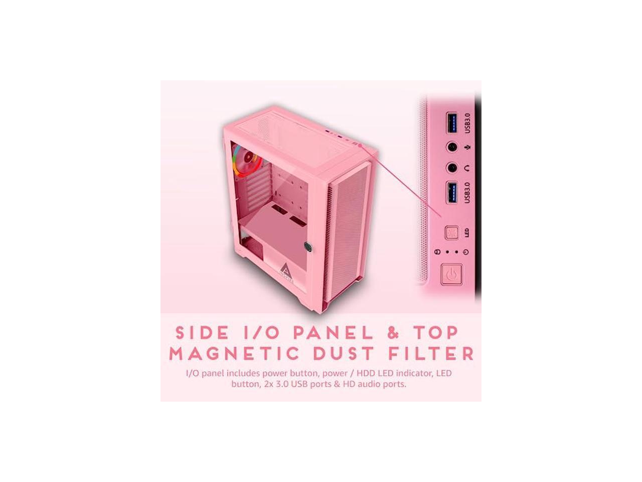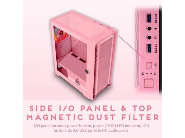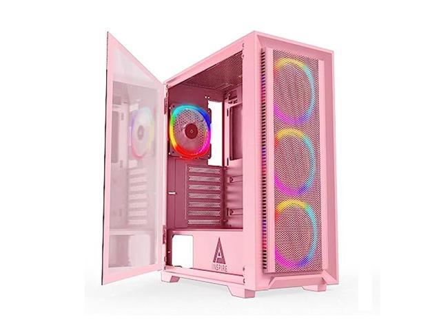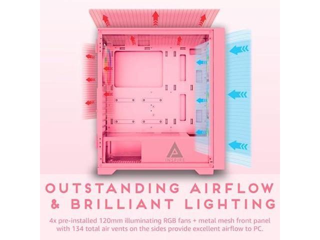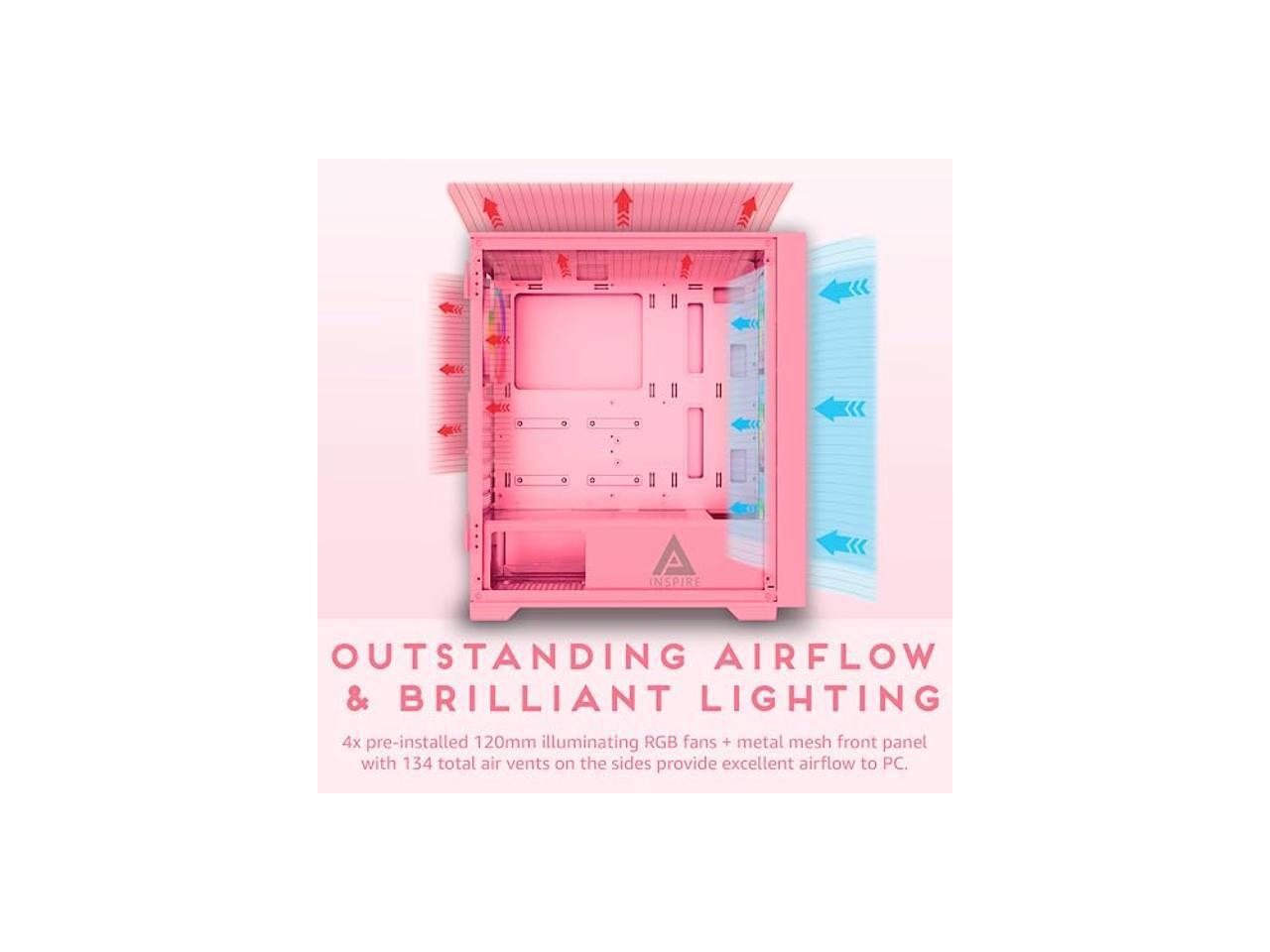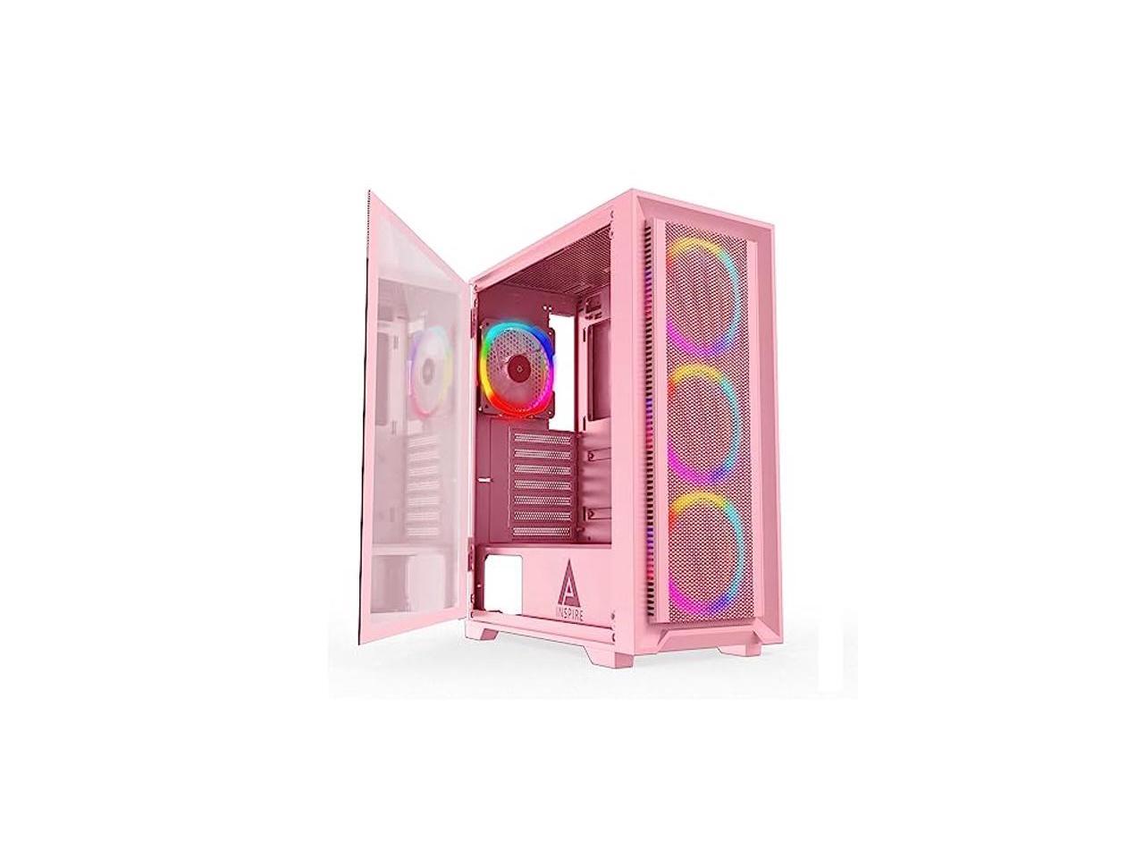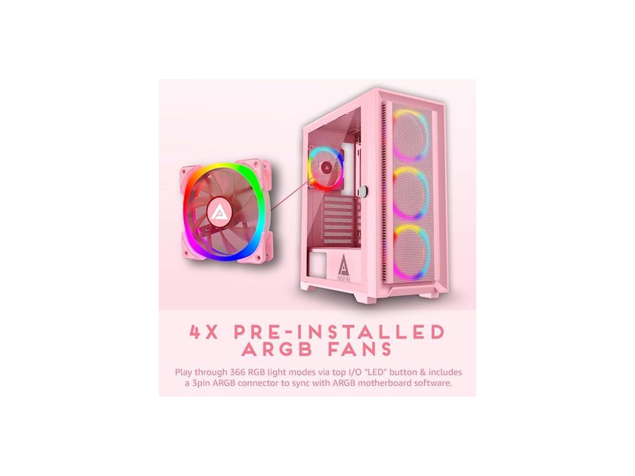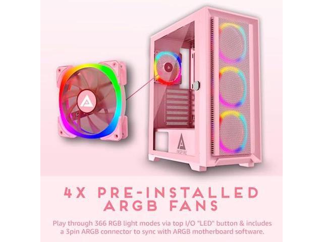 Apevia Inspire-PK Inspire Mid Tower ATX Gaming PC Case w/ 4X 120mm ARGB Fans, 366 RGB Light Modes, 1x Metal Mesh Airflow Front Panel, 1x Door Swivel Style Magnetic Glass Side Panel, 2X USB3.0, Pink