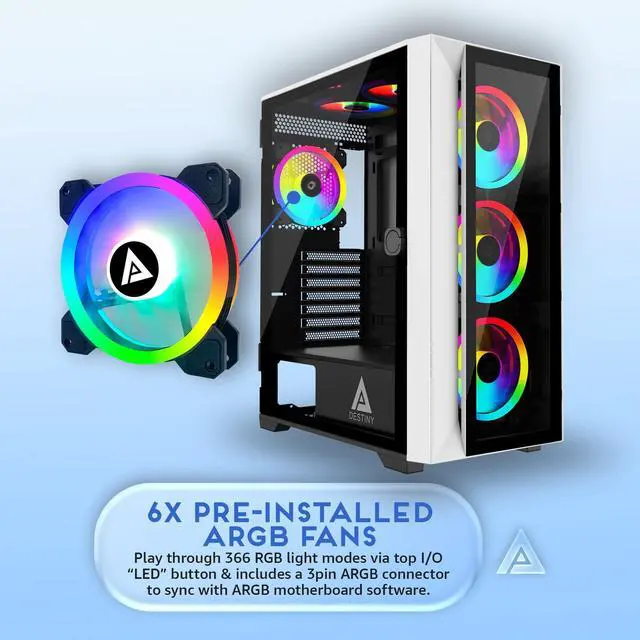 Apevia Destiny-PRO-WH Destiny Pro Mid Tower Gaming PC Case w/ 6X 120mm ARGB Fans, 366 RGB Light Modes, 1x Glass Front Panel, 1x Door Swivel Style Magnetic Glass Side Panel, 2X USB3.0, White