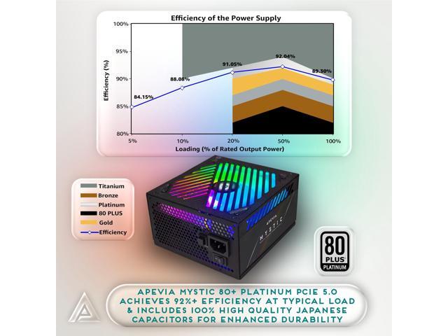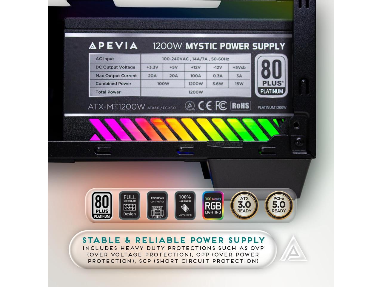 Apevia ATX-MT1200W Mystic 1200W Fully Modular 80+ Platinum Certified, PCIe 5.0 & ATX 3.0 Ready Active PFC ATX RGB Gaming Power Supply, Includes Gen 5 12VHPWR Connector & 366 RGB Light Modes