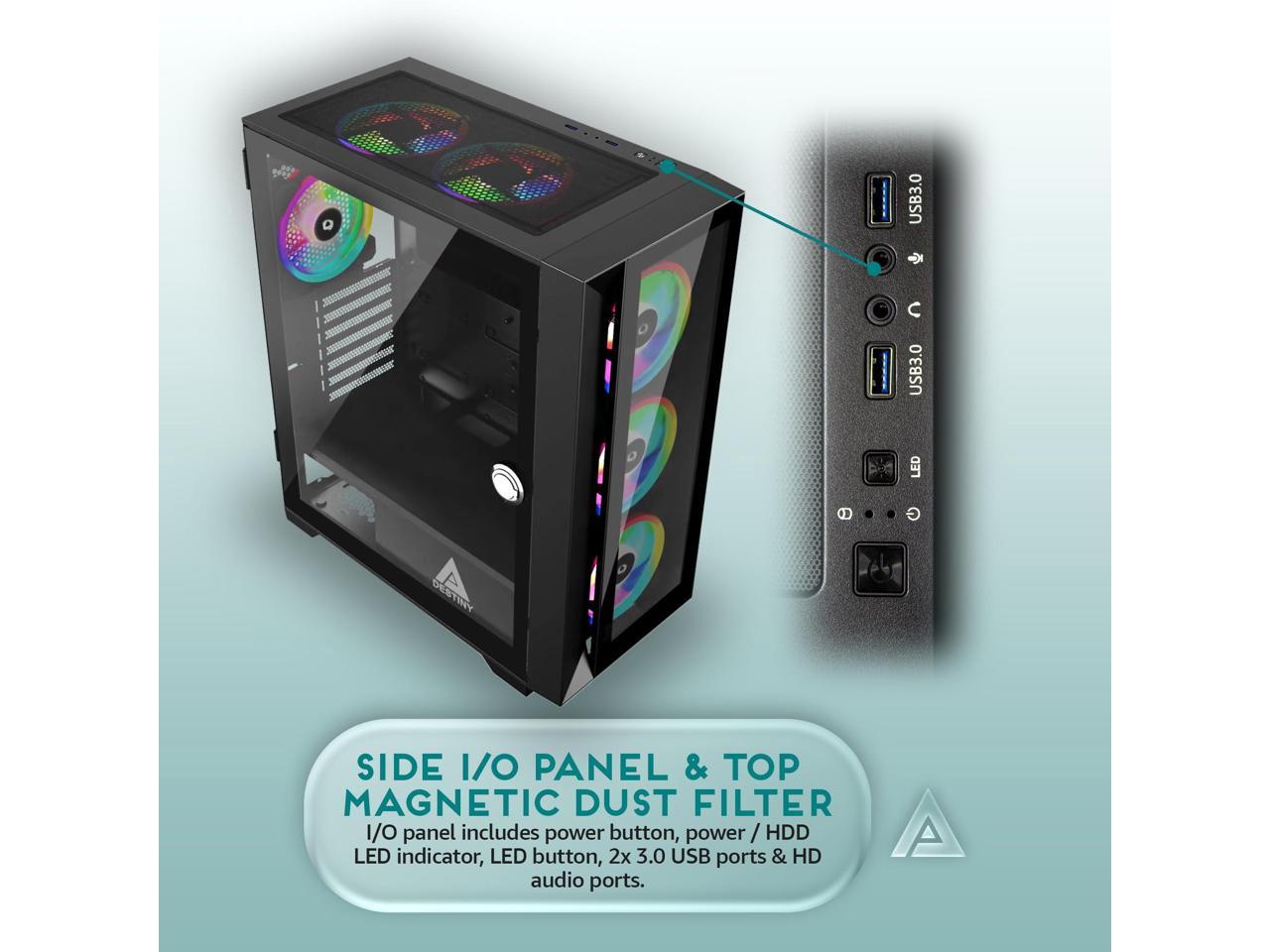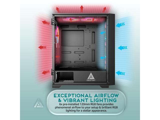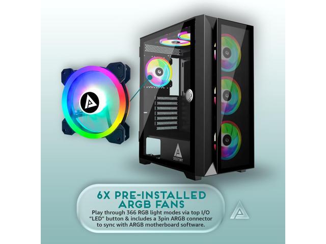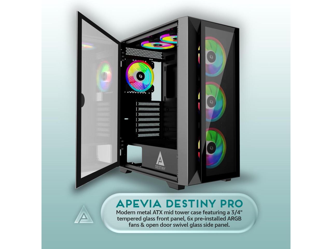 Apevia Destiny-PRO-BK Destiny Pro Mid Tower Gaming PC Case w/ 6X 120mm ARGB Fans, 366 RGB Light Modes, 1x Glass Front Panel, 1x Door Swivel Style Magnetic Glass Side Panel, 2X USB3.0, Black