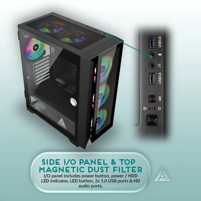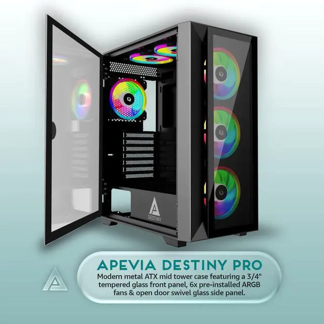 Apevia Destiny-PRO-BK Destiny Pro Mid Tower Gaming PC Case w/ 6X 120mm ARGB Fans, 366 RGB Light Modes, 1x Glass Front Panel, 1x Door Swivel Style Magnetic Glass Side Panel, 2X USB 3.0, Black