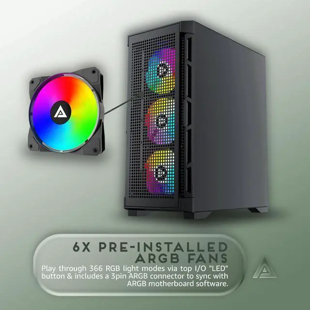6x 120mm ARGB fans pre-installed in case, comes with 3pin ARGB connector on RGB fans for ARGB motherboard sync (Only compatible with ARGB motherboards). RGB fans has 366 RGB lighting modes via RGB light switch button on top of case (Press down on LED button for 5 seconds to switch to motherboard ARGB sync mode).