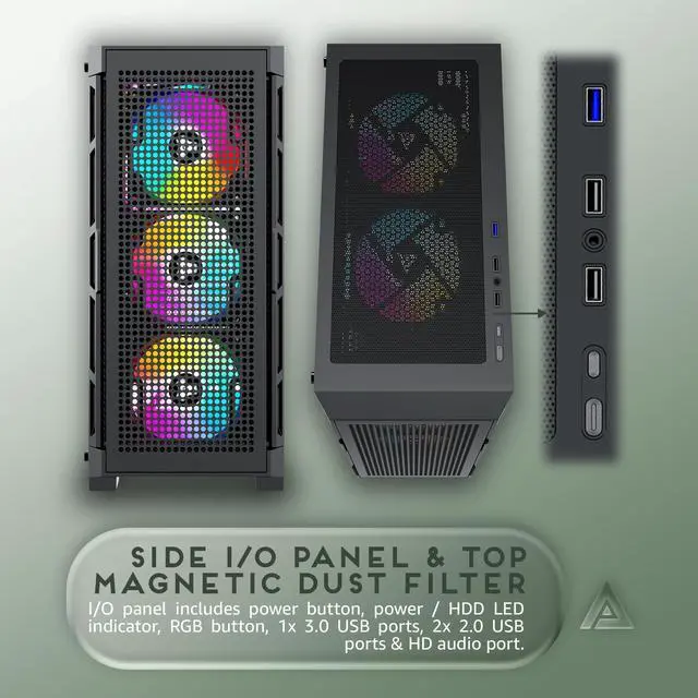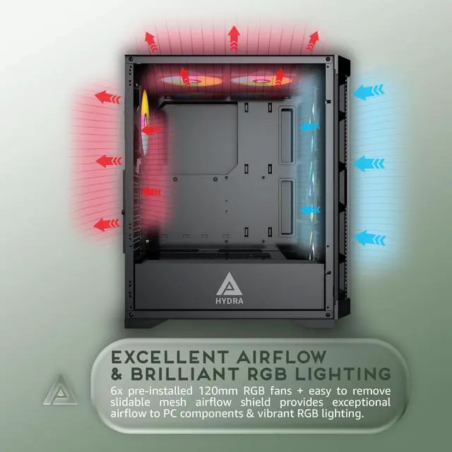 Apevia Hydra-BK Hydra Mid Tower Gaming PC Case w/ 6X 120mm ARGB Fans, 366 RGB Light Modes, High Performance Breathable Airflow Mesh Front Panel, Tempered Glass Side Panel, 1X USB 3.0, 2X USB 2.0, Black