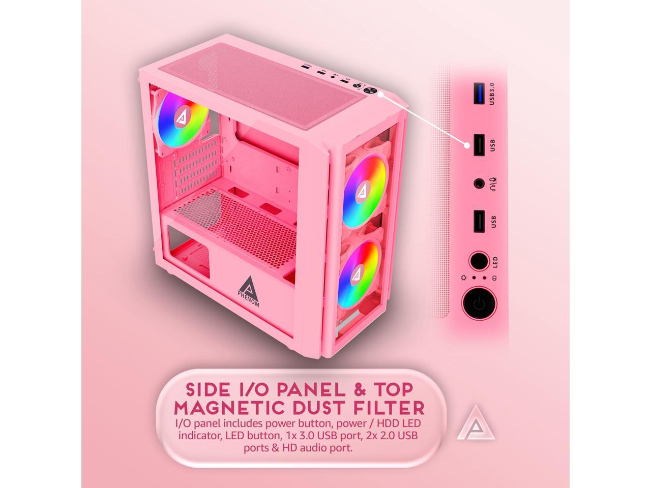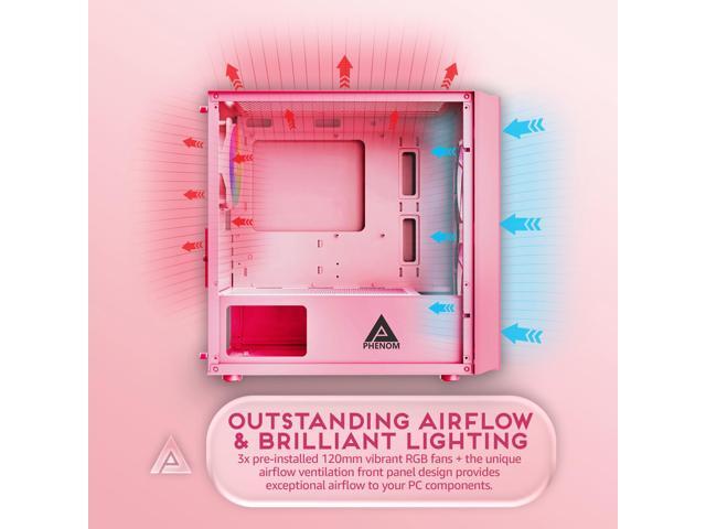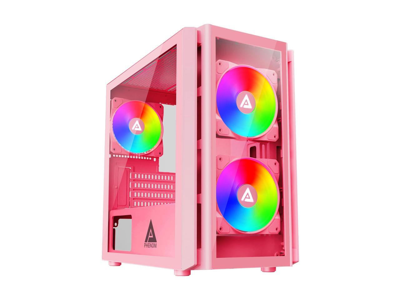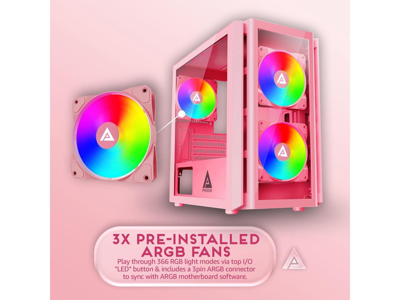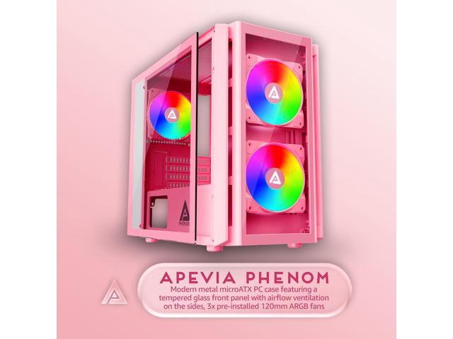 Apevia Phenom-PK Phenom Micro-ATX Gaming PC Case w/ 3X 120mm ARGB Fans, 366 RGB Light Modes, 1x Glass Front Panel, 340MM GPU Support, 1X USB3.0, 2X USB 2.0, Pink