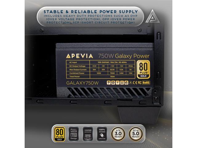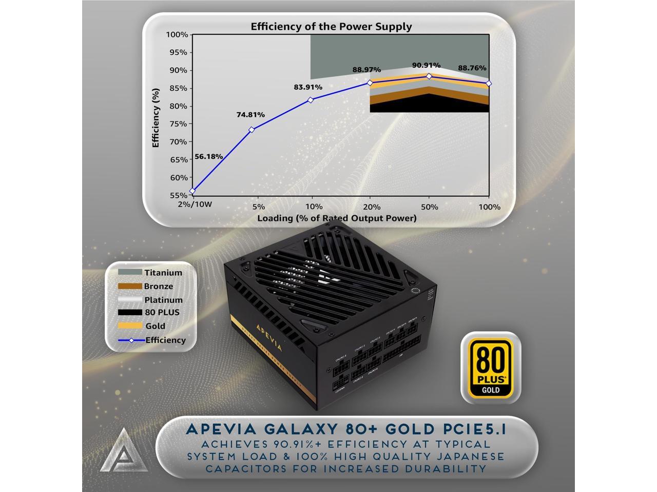 Apevia Galaxy 750W 80+ Gold ATX 3.1 Fully Modular Gaming Power Supply, PCIe 5.1 Ready 16-Pin 12VHPWR PSU, 100% Japanese Capacitors, Silent 135mm FDB Fan, Stable +12V Rail for RTX 40/50 Series