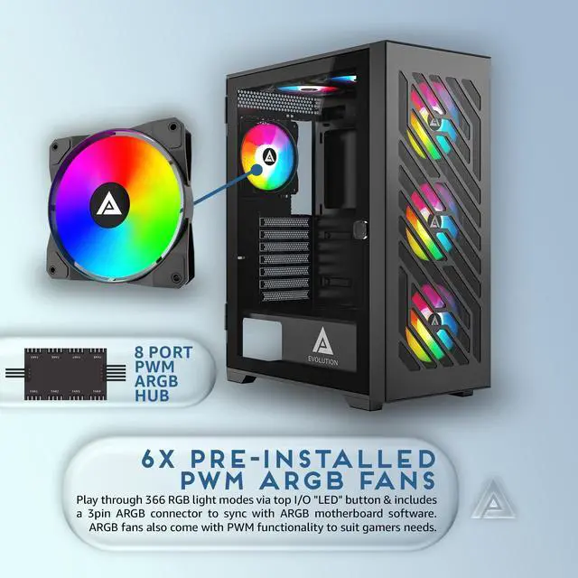 Modern metal mid tower with left-side tempered glass door swivel open style magnetic side panel & metal plate mesh front panel design. Plenty of room on the back side to hide and route cables. Can fit graphics cards up to 360mm in length and CPU coolers up to 165mm in height ^^ 6x 120mm PWM ARGB fans pre-installed in case, comes with 3pin ARGB connector on RGB fans for ARGB motherboard sync (Only compatible with ARGB motherboards). RGB fans has 366 RGB lighting modes via RGB light switch button on top of case (Press down on LED button for 5 seconds to switch to motherboard ARGB sync mode).