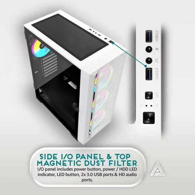 Modern metal mid tower with left-side tempered glass door swivel open style magnetic side panel & front panel metal mesh with airflow design. Plenty of room on the back side to hide and route cables. Can fit graphics cards up to 360mm in length and CPU coolers up to 165mm in height ^^ 4x 120mm ARGB fans pre-installed in case, comes with 3pin ARGB connector on RGB fans for ARGB motherboard sync (Only compatible with ARGB motherboards). RGB fans has 366 RGB lighting modes via RGB light switch button on top of case (Press down on LED button for 5 seconds to switch to motherboard ARGB sync mode) ^^ Top panel comes with 2 x USB 3.0 & HD Audio jacks.