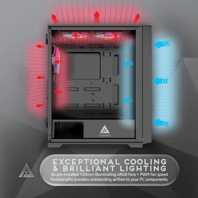 Apevia Aurora-BK Aurora Mid Tower Gaming PC Case w/ 6X 120mm PWM ARGB Fans, 366 RGB Light Modes, 1x Glass & Mesh Front Panel, 1x Door Swivel Style Magnetic Glass Side Panel, 2X USB3.0, Black