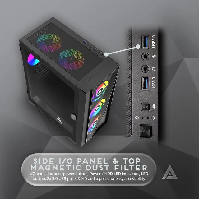 Modern metal mid tower with left-side tempered glass door swivel open style magnetic side panel & stylish front panel tempered glass & mesh design. Plenty of room on the back side to hide and route cables. Can fit graphics cards up to 360mm in length and CPU coolers up to 165mm in height ^^ 6x 120mm PWM ARGB fans pre-installed in case, comes with 3pin ARGB connector on RGB fans for ARGB motherboard sync (Only compatible with ARGB motherboards). RGB fans has 366 RGB lighting modes via RGB light switch button on top of case (Press down on LED button for 5 seconds to switch to motherboard ARGB sync mode).