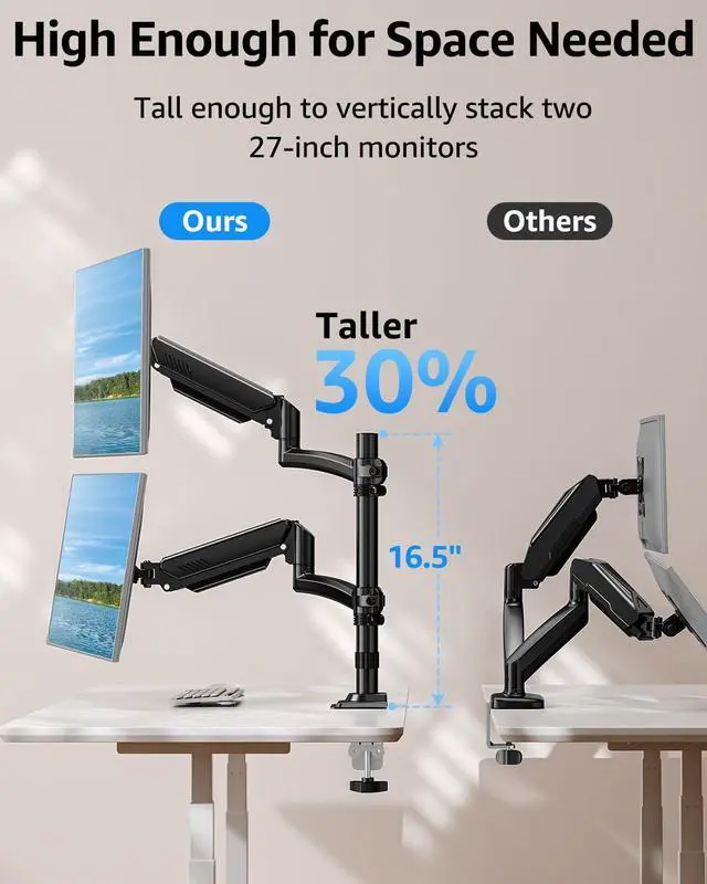 Gas Spring Arm for Effortless Adjustments: Smooth height and position adjustments with a gas spring mechanism. These flexible adjustments allow to position monitors side by side, stacked 2 x 27inch monitors, or angled, adapting to work or gaming needs.