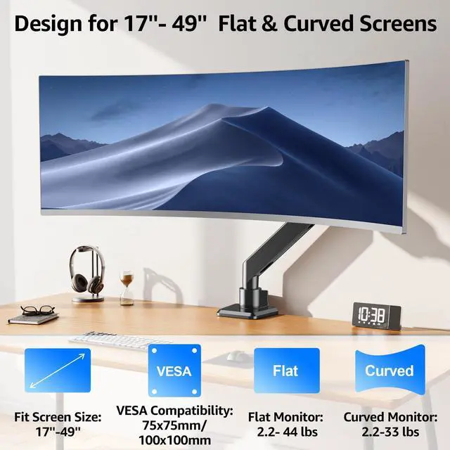 Engineered for Ultrawide Performance: Designed specifically for ultrawide and heavy-duty monitors, this monitor arm supports screens from 17 to 49 and weights from 4.4 to 44lbs, compatible with Samsung Odyssey G9, G95C, S95UA, CRG9, G95SC, G91SD, G93SC Series 49 curved monitor, Odyssey Neo G7, ASUS, Acer, LG, HP, AOC, BenQ, MSI, Dell, Lenovo, etc curved displays. The heavy duty monitor arm delivers unmatched strength and stability for wide and curved setups, making it a must-have ultrawide monitor mount for serious professionals and gamers.