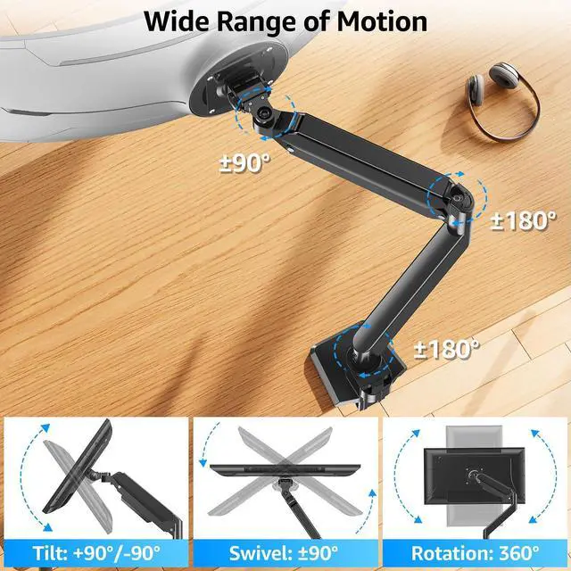 Full Motion Flexibility: Experience smooth and precise positioning with gas spring technology. Each computer monitor stand arm offers 360° rotation, ±90° swivel, and an impressive tilt range of +90° to -90°, with a max height of 17.3 and arm extension of 21.7. This monitor desk mount ensures ergonomic comfort whether youre working, editing, or gaming.