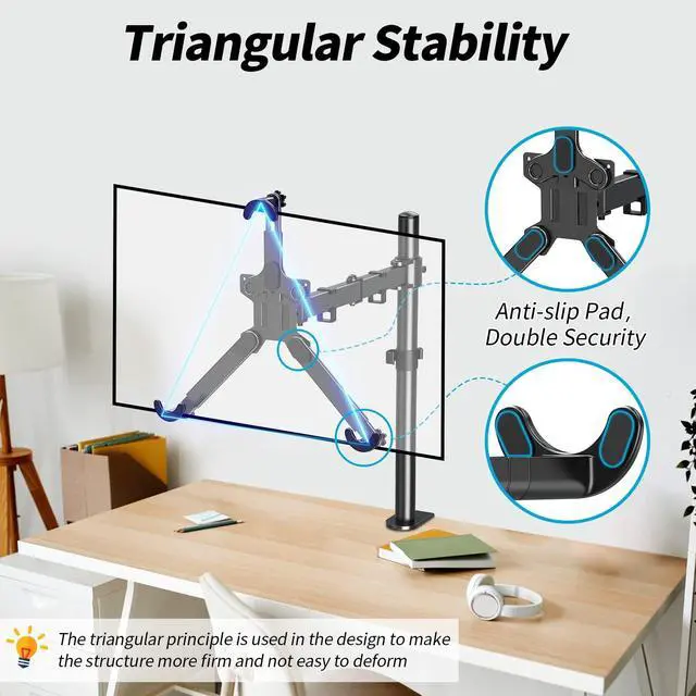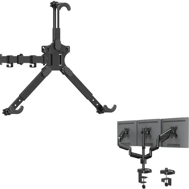 Monitor Mount: The fully adjustable monitor arms can tilt 90, swivel 90, and support rotation 360 degrees. The Center screen can be height adjusted, 2 gas spring arms make the extension, retraction, and height adjustment dynamically and easily. With multiple screen combinations, easily find an optimal viewing angle and position for comfortable work.