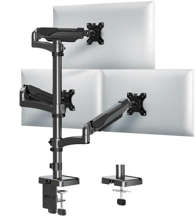 Universal Monitor Desk Mount-Hold up to triple 32" monitors. Each arm can hold 4.4 Ibs- 17.6 Ibs /2kg-8kg monitor with 75mm x75mm or 100mm x 100mm VESA mounting holes. ^^ Friendly Height Design-Triple monitor mount for desk has a 28 inch pole and the maximum height can be raised to 36.3 inches. The gas spring arm can also extend up to 20.5 inches to the front. ^^ Customize Your Screen Angle-This full motion triple monitor stand allows your monitor 90 tilt, 180 swivel and 360 rotation to find an optimal view angle to meet your demands.