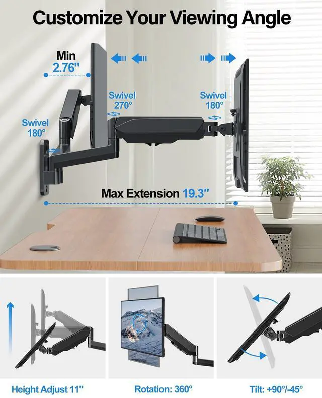 NOTE: Not for dry wall alone application. ^^ Full Motion Dual Monitor Arm - Offer a wide range of movement, the flexible gas spring monitor arm allows your screen to tilt, swivel, height adjust, and 360 rotate from landscape to portrait to find an optimal ergonomic posture, relieve strain on your spine, neck, and shoulders. ^^ Save Space & Easy Installation - Instead of mounted on the desk, our computer monitor mount holds your monitor on the wall, free up more space on your workstation. Comes with clear instruction and all the mounting hardware needed. Detachable VESA plate makes it simple to attach your monitor. ^^ Sturdy Construction & Longer Life - Premium gas spring makes movement easier and smoother. Heavy duty VESA monitor wall mount built with quality aluminum securely holds the monitor stable. ^^ Friendly Customer Service - Do not hesitate to relate with us for any pre-purchase or installation questions. We are confident in our monitor mount's construction, strength, and durability, which provides 3-year support.