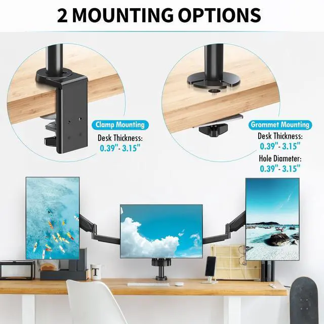 UNIVERSAL COMPATIBILITY - Triple monitor stand perfectly fits most brands of 13" to 27" LCD flat or curved screens, with a maximum support weight of 17.6 lbs per arm, compatible with VESA 75x75mm and 100x100mm.