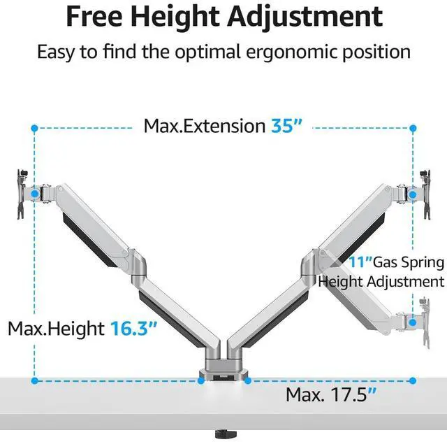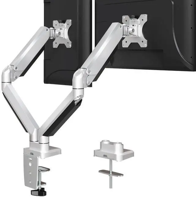 You can post your monitor at different heights to meet your eye level or posture. Please adjust the tension of the arm according to your monitor weight. ^^ Free Up Your Desk Space - The computer monitor mount can mount on the edge of a desk or through a grommet hole, free up a huge of space on your desk, make your workstation spacious and tidy. Built-in cable management system, easily hide your cable into the cover under the two arms. No more mess on your desk, keep cable organized! ^^ Upgraded Stability - Unlike ordinary steel products, the double monitor mount is made of high-quality die-cast aluminum, more sturdy and durable.