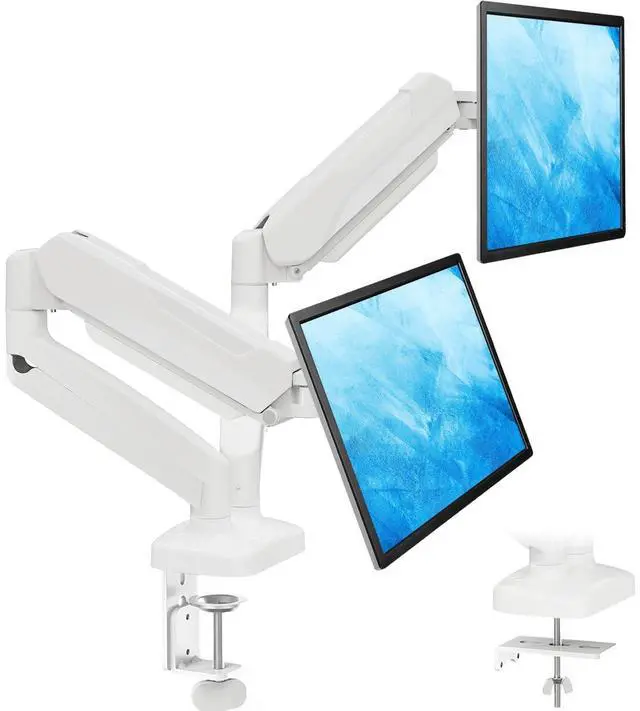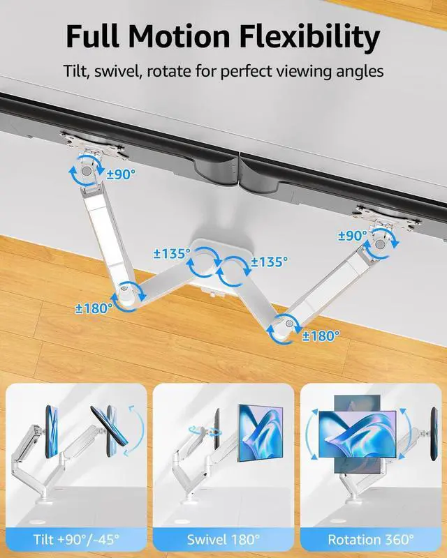 The dual monitor arm allows you to customize how you work or collaborate with 135 tilt, 180 swivel, and 360rotation (from portrait to landscape). Each connection of the arm is adjustable. You'll be able to pose your screen where you want it. ^^ Quick Installation - Easy assembly with the C-clamp or grommet base. The C-clamp fits the desktops 0.39" - 4.53" thick and the grommet mounting fits the desktop 0.39" - 3.15" thick with a bolt-through hole 0.39" - 2.36". ^^ Premium Spring Arms - Extensive quality testing ensures your computer monitors stay stable and secure.