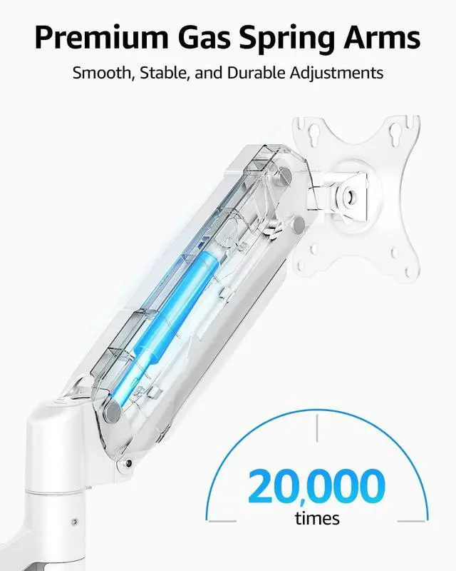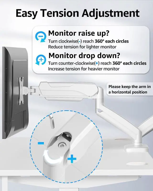 The monitor arm offers full monitor movement with 19.9" of arm extension and 9.4 '' of height adjustment range. The dual monitor arm with a spring system provides smooth and durable adjustments. Please adjust the tension of the spring arm properly according to the weight of your monitor. ^^ Professional Space Saver - The dual monitor mount with cable management, conceals wires within arms and frees up more desk space by holding 2 monitor arms. Getting your monitors off your desktop will provide you with extra room for your favorite desk decor. Just enjoy your working, gaming, or viewing hours in a more comfortable environment.