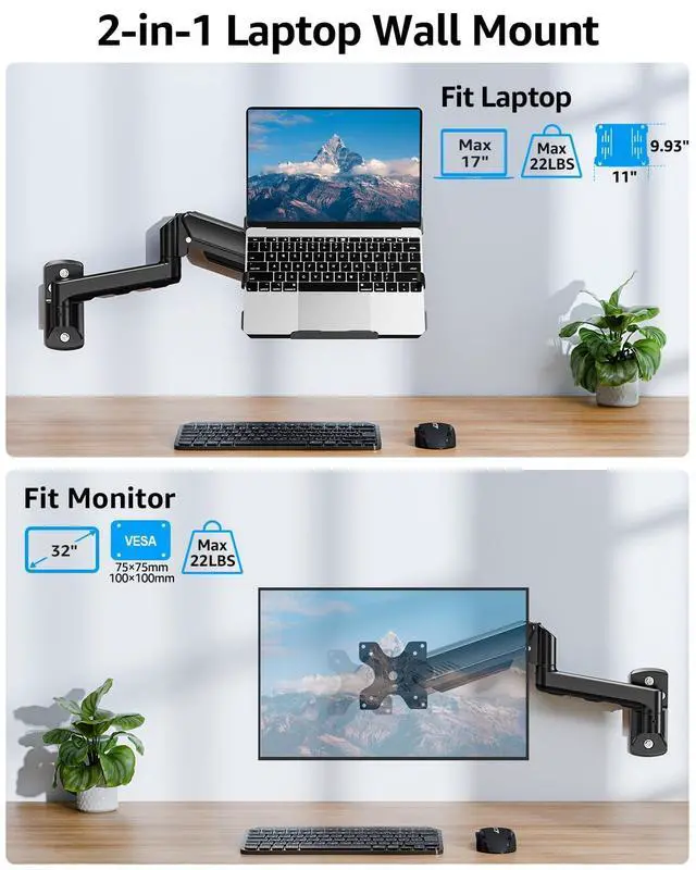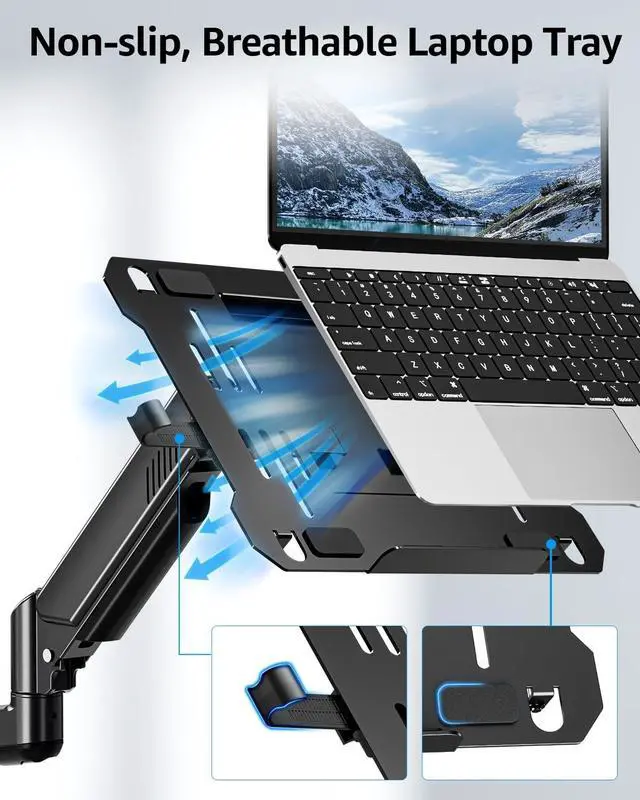 Maximum Flexibility & Reach: This laptop wall mount supports +70 to -45 tilt, 180 swivel, and 360 rotation (monitor only), plus 11-inch height adjustment and 20.7 -inch extended reach. Perfect for real-life usefollow recipes hands-free in the kitchen, display patient info in a dental clinic, check orders in a warehouse, or read sheet music in a piano room. Easily adjust the screen to the ideal viewing angle wherever you need it. ^^ Secure Laptop Tray - The all-new laptop tray features a clever latch that locks your laptop in place, preventing slips or falls during work or gaming. Its open design also maximizes airflow, keeping your device cool and running efficiently. ^^ Space-Saving & VESA Compatible - Lift your laptop or monitor off the desk and free up to 80% of your workspace. This laptop vesa mount supports standard 7575 mm and 100100 mm patterns, making it compatible with most monitors. Ideal for small dorms, crowded offices, or home setups, keeping your desk clean and organized. ^^