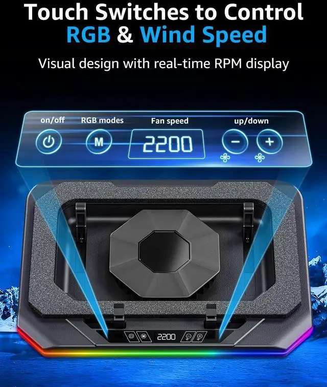 ^^ Touch-Sensitive Controls: Adjust fan speed and RGB lighting modes with a simple touch. The responsive touch switches on this laptop cooler cooling pad allow for quiet and easy operation, giving you complete control over your cooling preferences without the noise of physical buttons. ^^ Fits 13-19