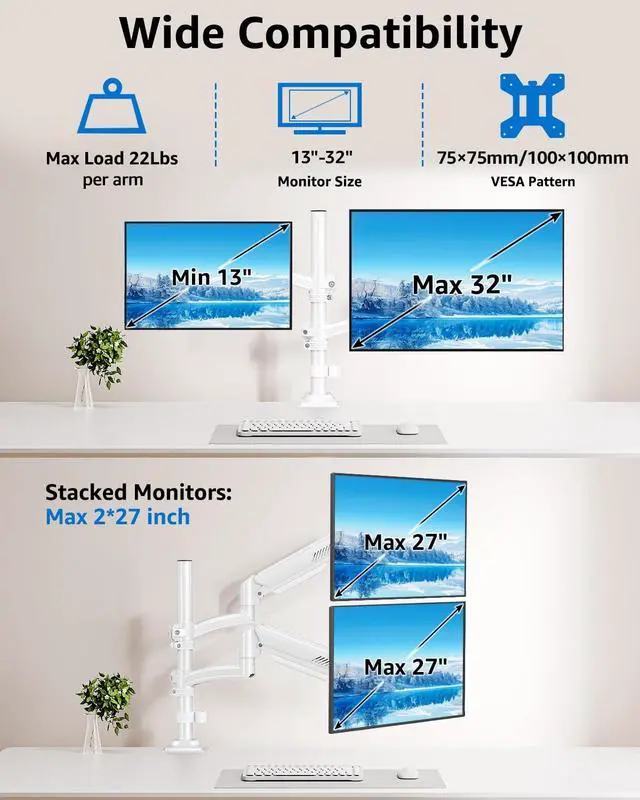 Universal Compatibility: Supports dual 13-32 inch monitors, each holding 4.4 -22 lbs, compatible with VESA 75x75mm & 100x100mm, ASUS, Acer, Samsung, Dell, LG, and other computers. ^^ Full Motion Adjustment for