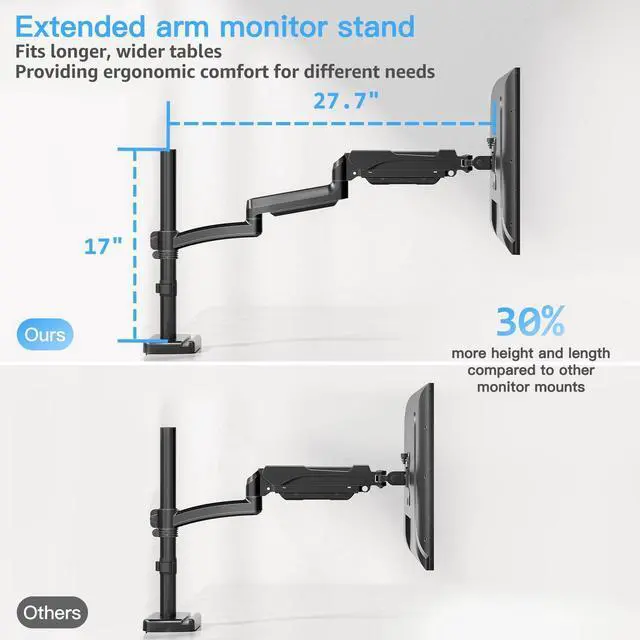Flexibility: Reach new heights with the extra long monitor stand. The arm is 30% longer than other mounts, offering up to 27.7" of extension. Position your single monitor stand exactly where you need it for ultimate comfort and viewing angles.