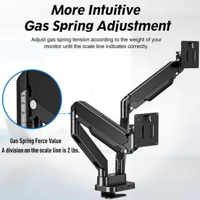 180/360swivel on arms, you'll be able to pose your screen where you want it. Increases viewing comfort by noticeably reducing strain on the eyes, back, and neck. ^^ Fully assembled and ready to install - The dual monitor stand fits most tables with a thickness of 0.39 ''- 1.77. C-clamp attaches to desktops; accessory grommet mount available to install through a desk surface hole (diameter: 0.4 - 2.4" ). With easy-to-follow instructions and labeled parts, this dual-screen desk mount can be assembled quickly and easily. If your desktop thickness is less than 1.77 '', please relate with us for a suitable longer clamp. ^^ Stylish and functional - The modern design is sleek and lightweight. Thanks to a streamlined cable routing under the arm, annoying cables remain outside the work area. In space-constrained areas, the monitor mount can be folded back to save space. When you adjust the tension, you can read the gas spring force from in the arm joint. Upgraded designed, monitor stand has a USB-A connector in the base (can be detachable), and comes with a USB 3.0 cable, which is great for charging devices. ^^ Safety and Stability - Extensive quality testing ensures your display stays stable and secure. The well-made, professional-grade monitor arm is backed by 3-year support. For safety, if mounted on a glass table, please install it with a reinforcement plate (not included).