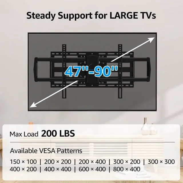 TV Wall Mount For Large TV: This heavy duty wall mount TV bracket fit most 47 to 90 inches LCE LED OLED smart flat curved TVs weighing up to 200 lbs, fits wood studs 16" 18" 24", brick or concrete wall. Compatible with multiple VESA patterns - 800x400 mm/ 600x400 mm/ 400x400 mm/ 400x300 mm/ 400x200 mm/300x300 mm/ 300x200 mm/ 200x200 mm/ 200x100 mm.