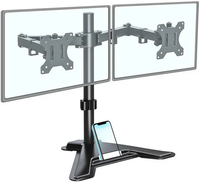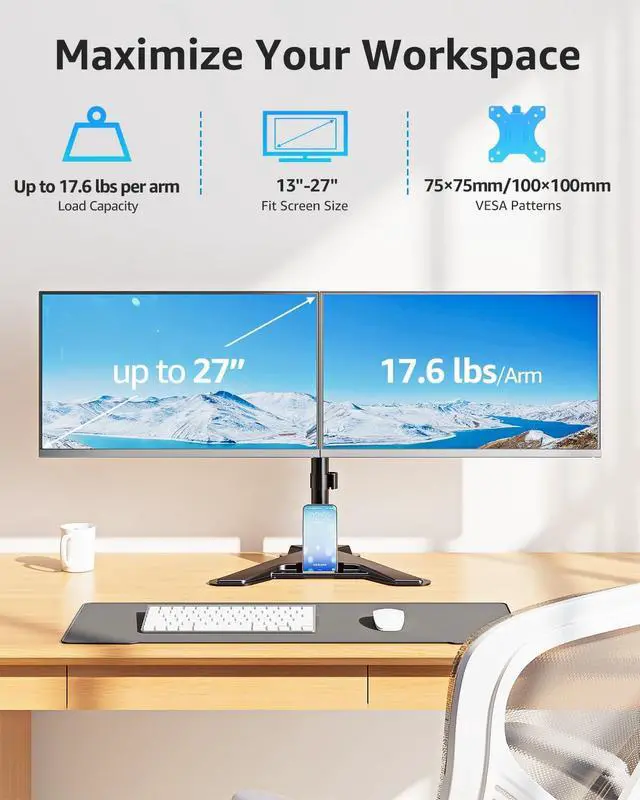 Universal Compatibility - Dual monitor mount fits with two screens max 27 inches and 17.6 lbs weight capacity. Compatible VESA pattern 75x75/100x100mm. Hanging 2 monitors simultaneously is an easy task. ^^ Freestanding Base - Hassle-free installation, no need to drill any grommet hole on your desk or use any clamp. Thus the goal of space-saving could be achieved. Glass table top is also compatible with this stand and no scratches would be made. ^^ Professional Space Saver - Save up your desk space by holding 2 branching monitor arms. It takes your desk organization to a whole new level.