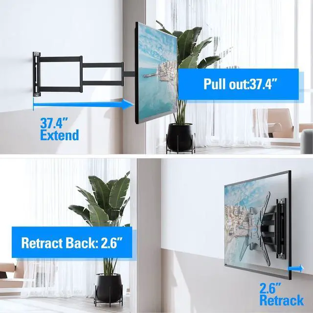 Extension TV Mount: Want a wall mount TV bracket with a flexible extension? This extra long arm TV mount extends 37.4" and retracts to the wall about 2.6" which greatly saves space and makes it convenient. The dual folding arm design allows the arm to be more flexible and can be realized to watch from room to room ^^