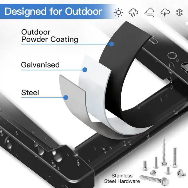 Specifically designed for outdoor use. Theres a rapidly growing trend in TVs being used in outdoor and semi-enclosed environments. Outdoor TV mount Fits for Gazebo Patio Backyard Balcony and so on. Creating an outdoor living space with a weatherproof TV mount. ^^ An impressive tilt angle for comfortable viewing. +5/-10 tilt and +/-3 leveling. Ensure the TV features high brightness and anti-glare properties for better visibility in outdoor lighting. ^^ Perfect Flexibility - 37.9" Long Arm & +/-90 smooth swivel. The long extension TV wall bracket extends 37.9" and retracting back to just 3" from the wall.