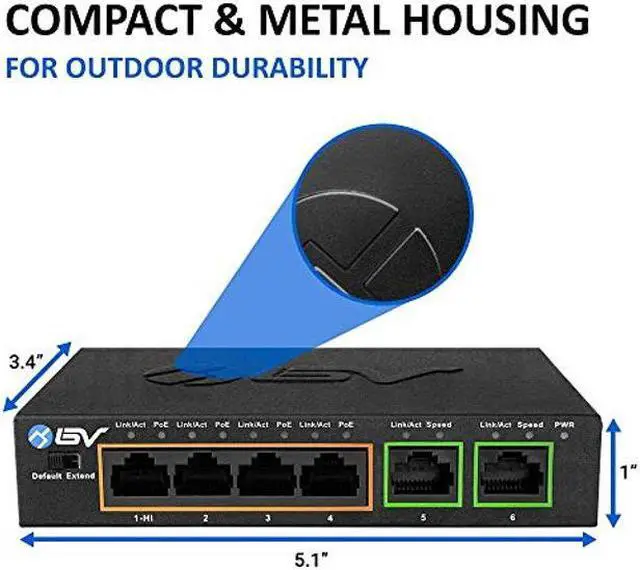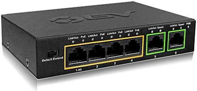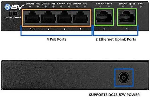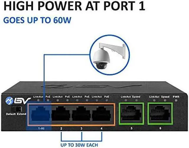 The POE-SW502 is an unmanaged 6-Port Power over Ethernet Switch with a total of 60 watts of PoE power. All ports run at 10/100Mbps and can provide up to 30W per port through the IEEE 802. 3at standard, as well as up to 60W on port 1 through Hi-PoE. It has two Ethernet uplink ports to allow for communication without sacrificing any PoE ports. It also features an "extend" switch to allow for PoE transmission of up to 820ft (which reduces data transmission to 10Mbps).