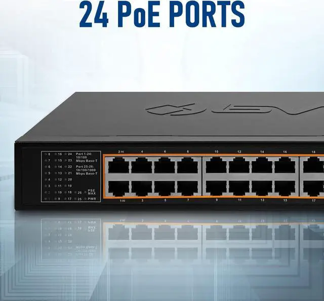 High-Density PoE Switch: Connect up to 24 devices with 24 PoE+ ports at 10/100Mbps each, supporting 802.3af/at. Deliver up to 30W per port with Hi-PoE at ports 1&2 providing up to 60W per port. Max power is 190W.