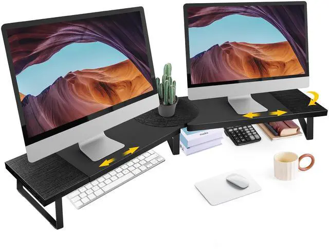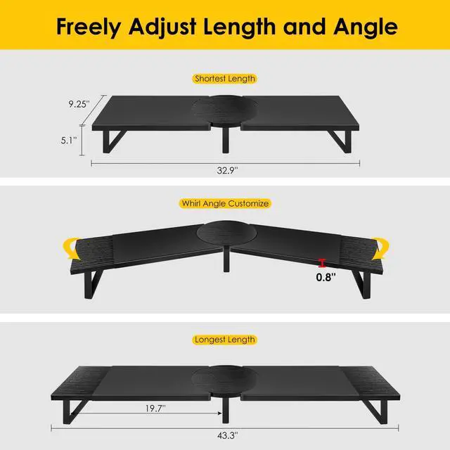 Adjustable Length & Angle:You could adjust the length of large computer stand for desktop monitor from 32 to 55 inch, which could be adjustable to accommodate 1-2 monitors/laptops to meet your office needs. Wiht the circular turntable in the middle, you could move monitor riser for 2 monitors at any angle to customize a comfortable position.