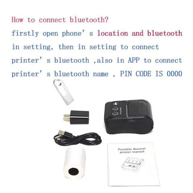 [How to connect bluetooth with mobile phone ] 1, peel off insulation paste on battery, then turn on printer 2, download APP and open App on your mobile phone or ipad 3, open mobile phone/ ipad's bluetooth and location in setting and connect printer's bluetooth, PIN code is 0000,also to connect bluetooth in APP, in APP search bluetooth name of printer and connect it, printer 's blueototh name is on self-test page,then could print receipt in APP