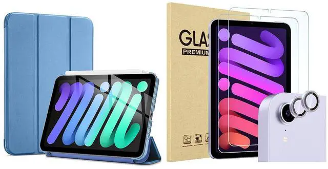 Procase smart case for iPad mini 6 8.3 inch 2021(blue) bundle with 2 pack screen protector + 2 pack camera lens protector matching ipad colors(purple).