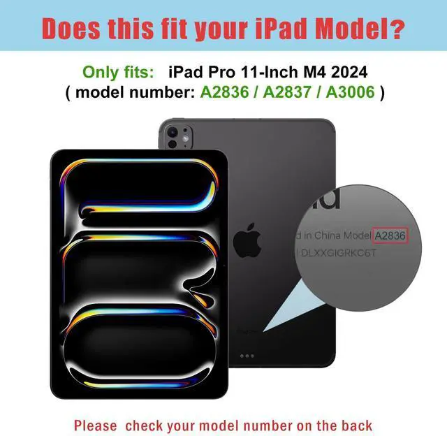 Keyboard case for iPad Pro 11-inch(M4) 5th Generation 2024(Model: A2836 /A2837 /A3006). Please check back bottom of your iPad to find the model number "Axxxx"