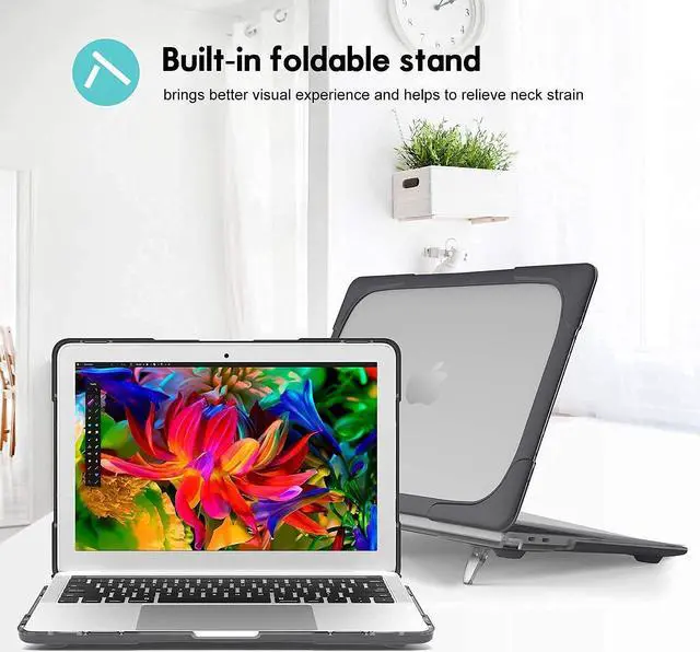 No cut out design, Apple logo shines through the case; Built-in foldable stand provides an ergonomic typing angle and a better visual experience, helping to relieve your neck strain