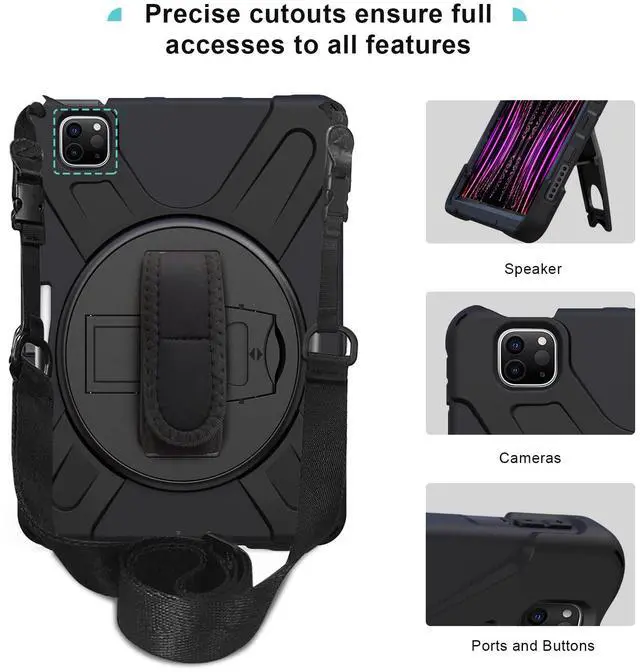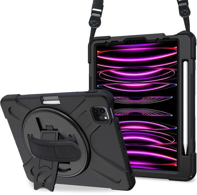 ProCase for iPad Pro 12.9 Inch Case 2022 2021 2020 2018, Rugged Heavy Duty Shockproof Cover with Hand Strap Shoulder Strap for iPad Pro 12.9" 6th 5th 4th 3rd Generation Black