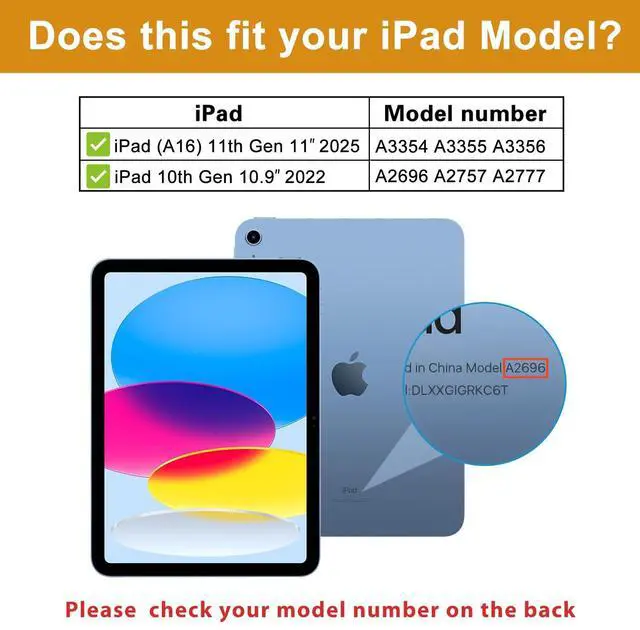 Compatible Tablet: Durable child case for iPad A16 11th Generation 11 Inch 2025(Model: A3354/A3355/A3356)/iPad 10th Generation 10.9 inch 2022(Model Number: A2696 A2757 A2777) ONLY. NOT compatible with any other models. Please check the back bottom of your iPad to verify the model number