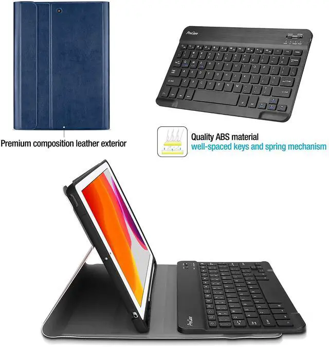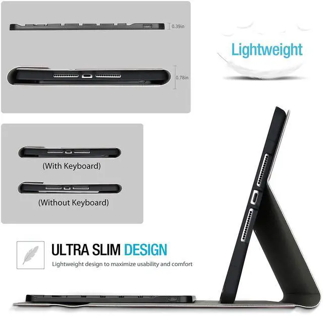 One Design: Wireless Keyboard + Stand + Carrying Case + Built in pencil holder, stylish and convenient, perfect for daily use and travel. Innovative magnetically detachable wireless keyboard design, easily remove the keyboard any time you want; Three dents on the case for propping up the tablet into three different viewing angles in landscape mode ^^ Lightweight and slim 7mm laptop-style keyboard made from quality ABS material, well-spaced keys and spring mechanism underneath offer better tactile response for users, providing a fast and smooth typing experience ^^ Premium composition leather exterior protects your tablet from accidental dropping and bumps; Soft anti-slip interior protects your tablet from being scratched ^^ Support auto Sleep/Wake function (only works WITHOUT the keyboard attached); Precise cutouts allow full access to all features (Cameras, Speaker, Ports and Buttons)