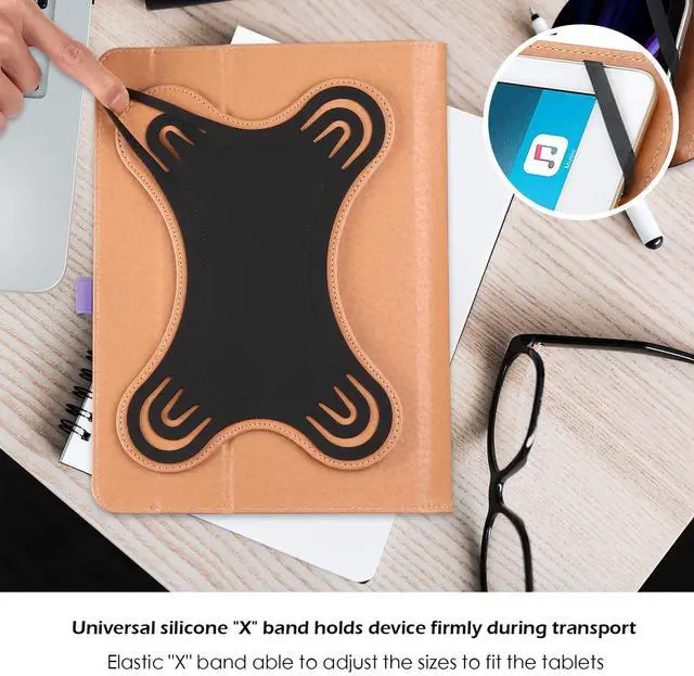 Universal Case compatible with 9- 10.1 tablets (Case for URAO, REVVL Tab 2, UMIDIGI G1 Tab, BYYBUO SmartPad A10_L, ApoloMedia EP103A, ECOPAD, ZZB ZB10, TECLAST P30, Jeazans OC101, POWMUS, HiGrace, Headwolf W5, UGRIHACH UG-C10, COOPERS CP10, Lville LVEC10, YQSAVIOR YQCP20, EHFiDC K11-blue, and other tablets with screen sizes between 9- 10.1 in, or outer dimensions between 10.5 - 7.5 inch (No back camera opening; NOT support auto sleep/wake for any tablets) ^^ Universal silicone "X" band holds device firmly during transport; Elastic "X" band able to adjust the sizes to fit the tablets ^^ Innovative 360 degree kickstand design and multiple stand slots allow users to set up the tablet into different viewing angles ^^ Premium composition leather exterior and soft interior offer great protection against daily use ^^ Built-in elastic stylus pen holder; Elastic band closure secures the case