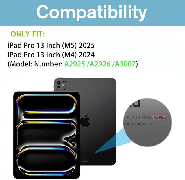 The quality screen protectors and camera lens protector exclusively designed for 2025 iPad Pro 13 inch (M5) 2025 (Model number: A3360, A3361, A3362) / iPad Pro 13 inch (M4) 2024 (Model number: A2925, A2926, A3007). Please check back bottom of your iPad to find the model number "Axxxx". ^^ 1 pack privacy screen protector only works in landscape mode - With this film on, your screen will only be visible to persons directly in front of screen, preventing the side-snoopers from viewing your screen. (Please note that the privacy cover will darken the screen a little to prevent the peeking eyes near you, so please turn up your device display brightness for better viewing experience) ^^ 2 pack camera lens protectors with precise cutouts offer great protection. HD clarity ensures the original shooting quality and supports night shooting function ^^ Face ID & Apple Pencil Compatible. Scratch-resistant; Shock-resistant; Oil-resistant; Case friendly ^^ Only takes seconds to install; Advanced silicone adhesive, no residue when removing