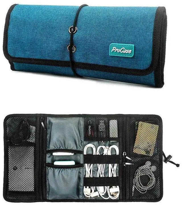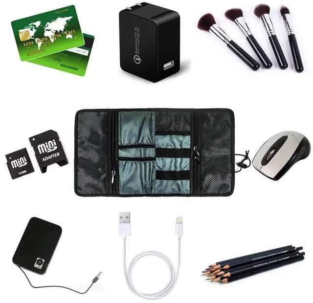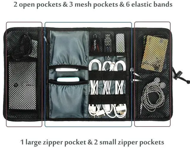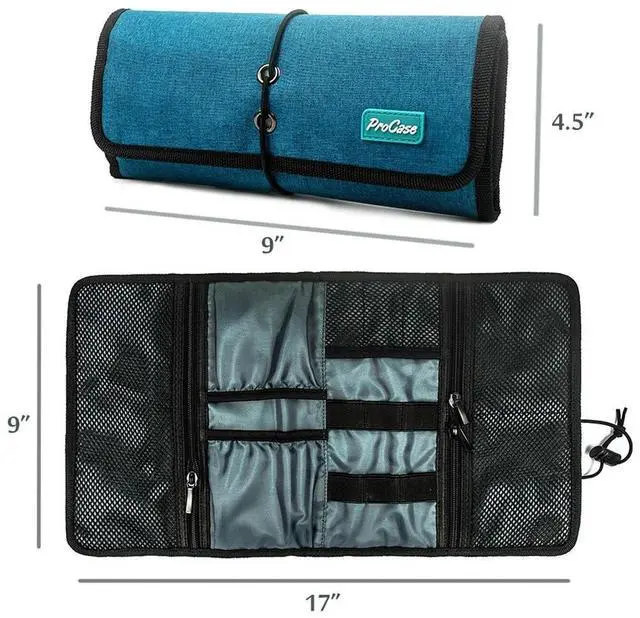 Dimension17"9" while open and 4.59" rolled up. The most versatile and lightweight electronics accessories organizer in market. Easily tuck in your purse, backpack, laptop case, briefcase, or suitcase ^^ Practical design provides great flexibility for organising your accessories. 6 elastic loops for cables, pens, brushes and tools, etc; 3 mesh pockets for USB, SD card, SIM card or other small items; 2 open pockets for charger, mouse, power adapter and etc ^^ 1 large zipper pocket for external hard drive, power bank, cellphone or other items.