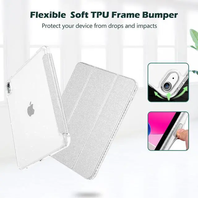 Release (Model: A2696 A2757 A2777). Also compatible with USB-C Pencil & 1st generation Pencil. Please check back bottom of your iPad to find the model number ^^ Transparent hard back cover shows off the original beauty of your device; Built-in pencil holder for keeping your pencil safe and secure ^^ Flexible TPU frame and soft microfiber lining protect your iPad from shocks, drops and scratches; Sleek front cover offers comfortable sense of touch ^^ Tri-fold front cover with two standing positions are provided for satisfying your viewing and typing needs ^^ Support auto Sleep/Wake feature; Magnet secures the case closure; Full access to all features (Cameras, Speaker, Ports and Buttons)