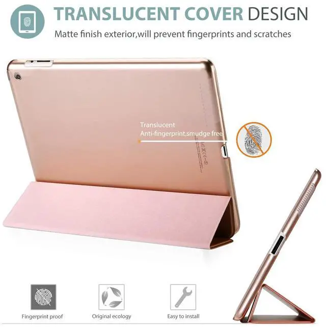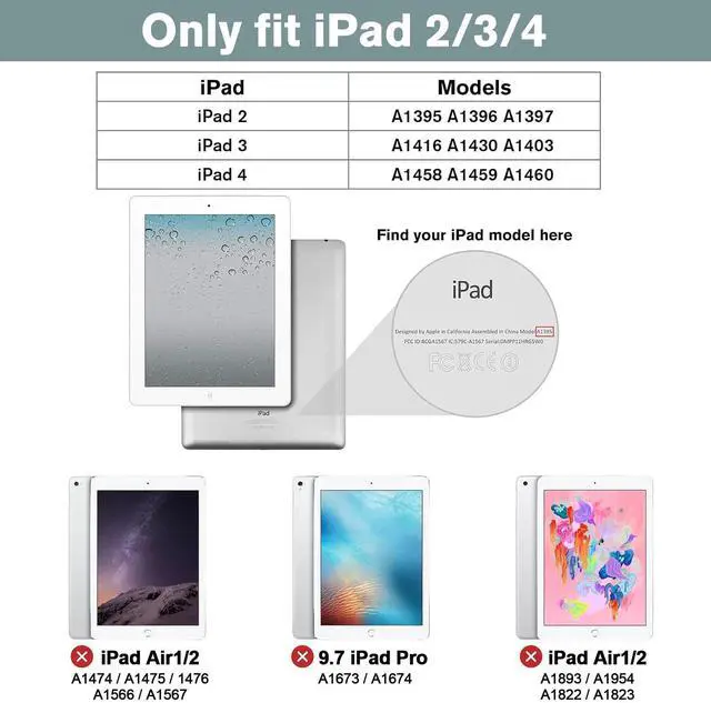 Protective stand case for old models: Apple iPad 2nd genA1395/A1396/A1397/3rd genA1416/A1430/A1403/4th genA1458/A1459/A1460(2012/2011 old Model). NOT compatible with any other iPad ^^ Ultra slim and lightweight hard back design adds minimal bulk while offering your device great protection ^^ The translucent frosted back cover allows you to see the Apple icon through your favorite color, while protecting your device against fingerprints and scratches ^^ Classic and professional design; Full access to all features (Cameras, Speaker, Ports, and Buttons) ^^ Support auto Sleep/Wake feature; Magnet secures the case closure, easy snap on and off