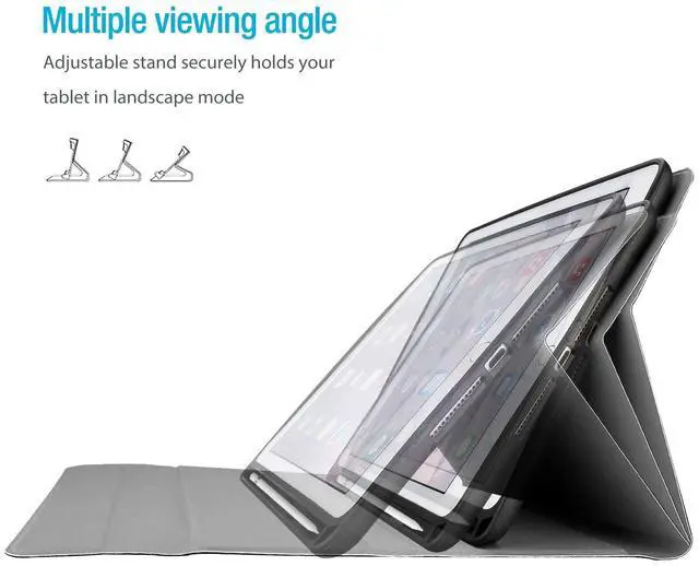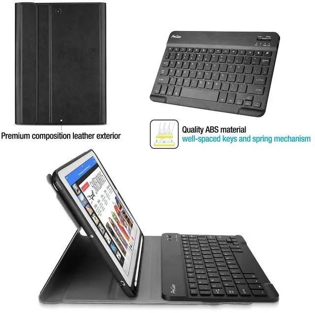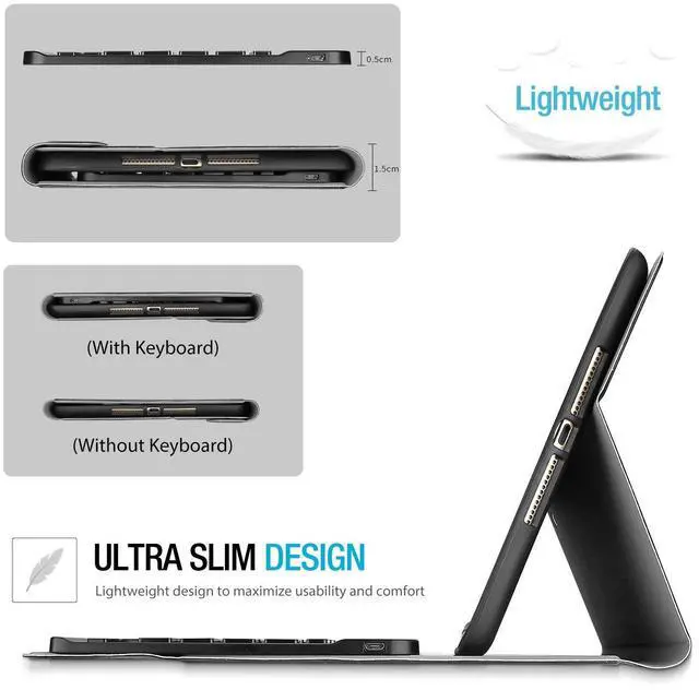 All in one design: Wireless keyboard + stand + carrying case, stylish and convenient, Perfect for daily use and travel ^^ Innovative magnetically detachable wireless keyboard design, easily remove the keyboard any time you want; three dents on the case for propping up the tablet into three different viewing angles in landscape mode ^^ Lightweight and slim 7mm laptop-style keyboard made from quality ABS material, well-spaced keys and spring mechanism underneath offer better tactile response for users, providing a fast and smooth typing experience; built-in Apple Pencil holder, store your Apple Pencil, Apple Pencil Cap and adapter effortlessly ^^ Premium composition leather exterior protects your tablet from accidental dropping and bumps; soft anti-slip interior protects your tablet from being scratched ^^ Support Auto sleep/wake function (only works without the keyboard attached); precise cutouts allow full access to all Features (cameras, speaker, ports and buttons)