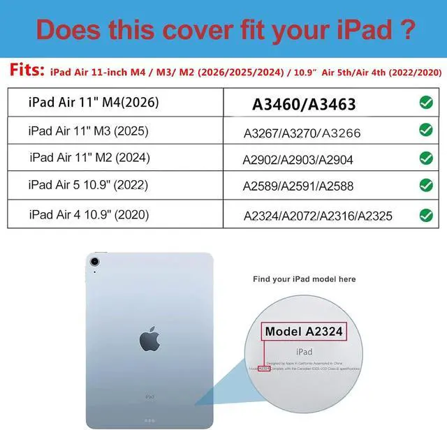 Inch (M2) 2024 (model number: A2902 A2903 A2904) / Air 5th Generation 2022 release / iPad Air 4th Generation 10.9 inch 2020 release(model number A2588/A2589/A2591/A2324/A2072/A2316/A2325); Please check back bottom of your iPad to find the model number;