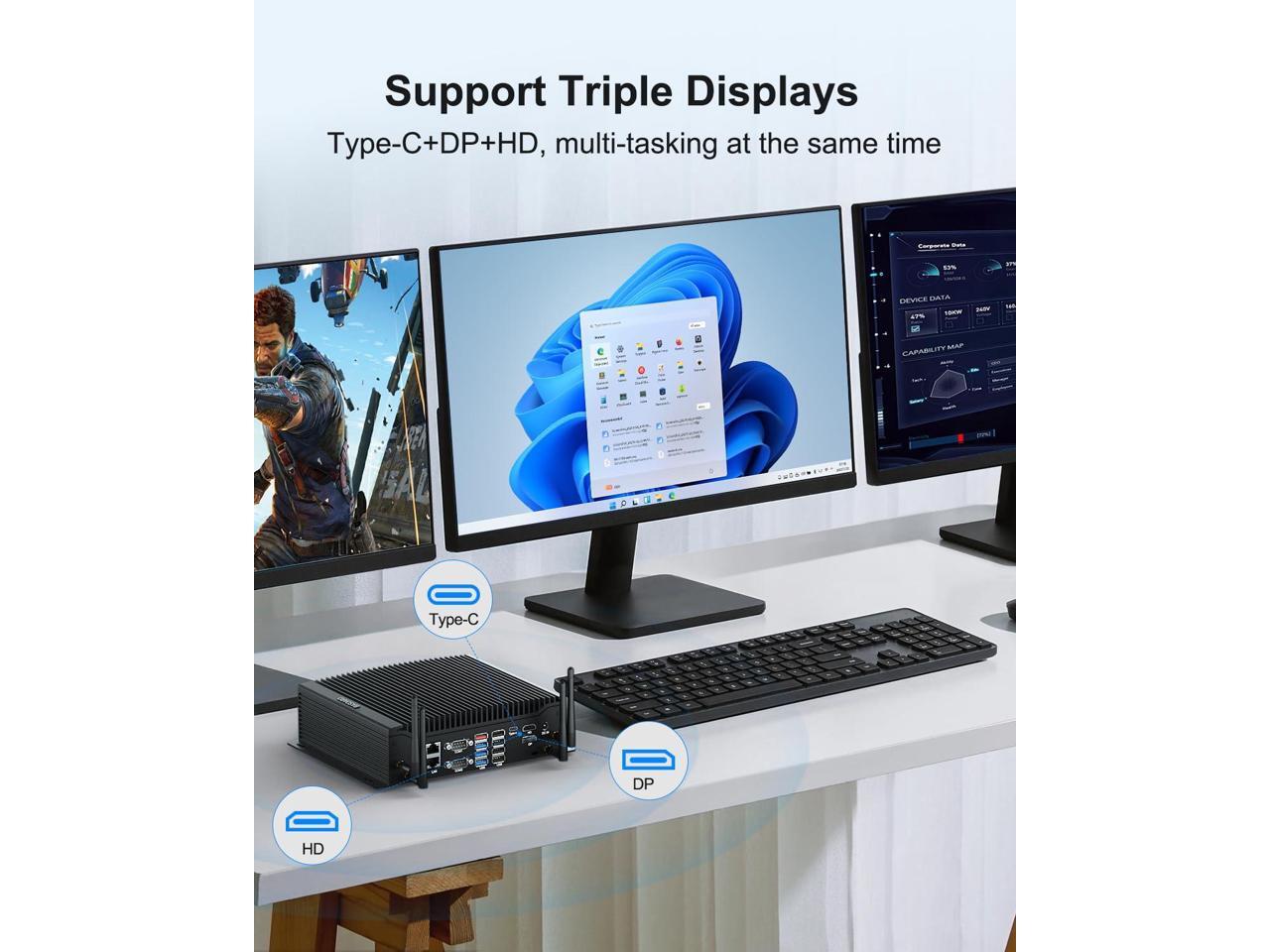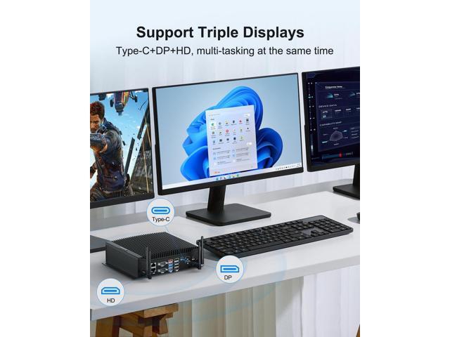 - [(4K UHD Triple Display)] This mini industrial computer supports simultaneous display on three screens via 1 x DP, 1 x HD and 1 x Type-C ports, so you can easily solve multiple tasks and increase your work efficiency. With built-in UHD graphics to ensure faster image processing and featured 4K UHD video playback, the micro pc is suitable for conference rooms, visual home entertainment, and education.